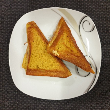 Das ganze wiederholst Du jetzt mit den anderen 2 Scheiben Toastbrot. Wenn der Sandwichmaker heiß ist, beide Sandwiches dort drin platzieren und fest zudrücken.